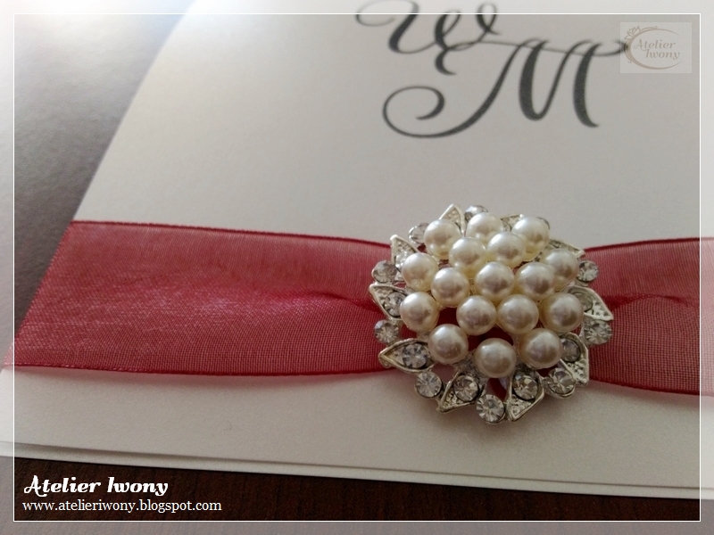 Dekoracje weselne perłowe z bordowymi wstążkami i perełkami