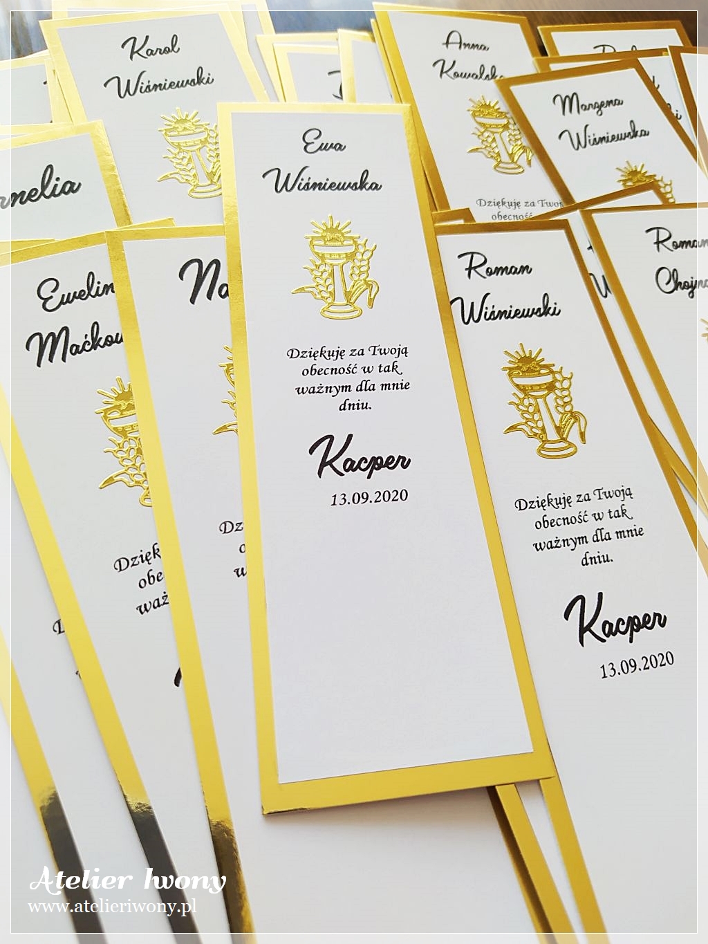 Winietki imienne z miejscem na czekoladkę - komunijne złote lustrzane z hostią